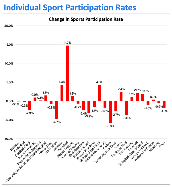 Among the many 30 sports activities with up to date participation knowledge, Pickleball stays the fastest-growing, with a 14.7% improve in participation.