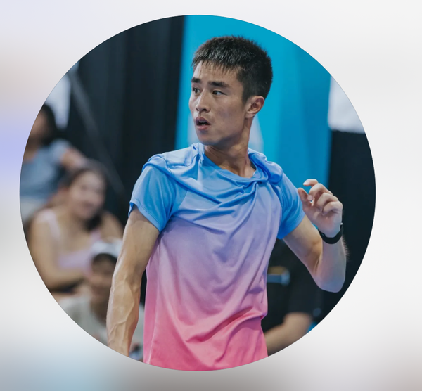 Wong Hongkit wore a pink and blue high with a Fitness center Aesthetics Asia emblem, bringing a vivid spring look with the daring gradient.